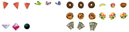 It's taken me awhile to work out the kinks on the dollars, but here we go! There's also cookies, pizza, gumballs, donuts, and some VV graphics.