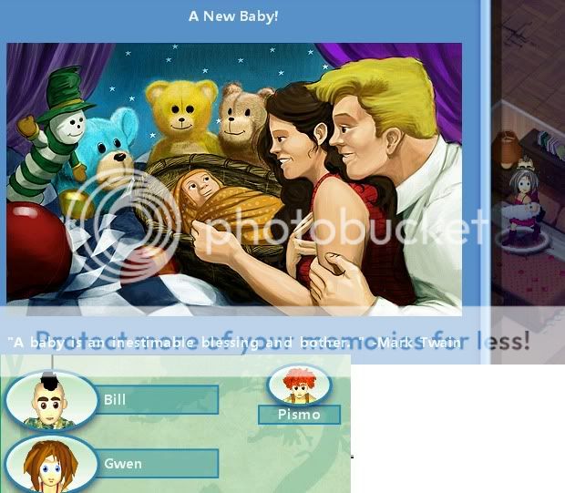 Thats exactly what I think would be nice. That way you can continue playing and not start from scratch. I can sympathise. I keep having to restart games but not because of bugs rather, because of my real family!  I haven't had the no-kids problem yet but I am...hmmm...persistent!  When I think they need a little one I keep hounding them evey 15 minutes or so for abit...about three/four times a day.  And they only thought they had each other to argue with