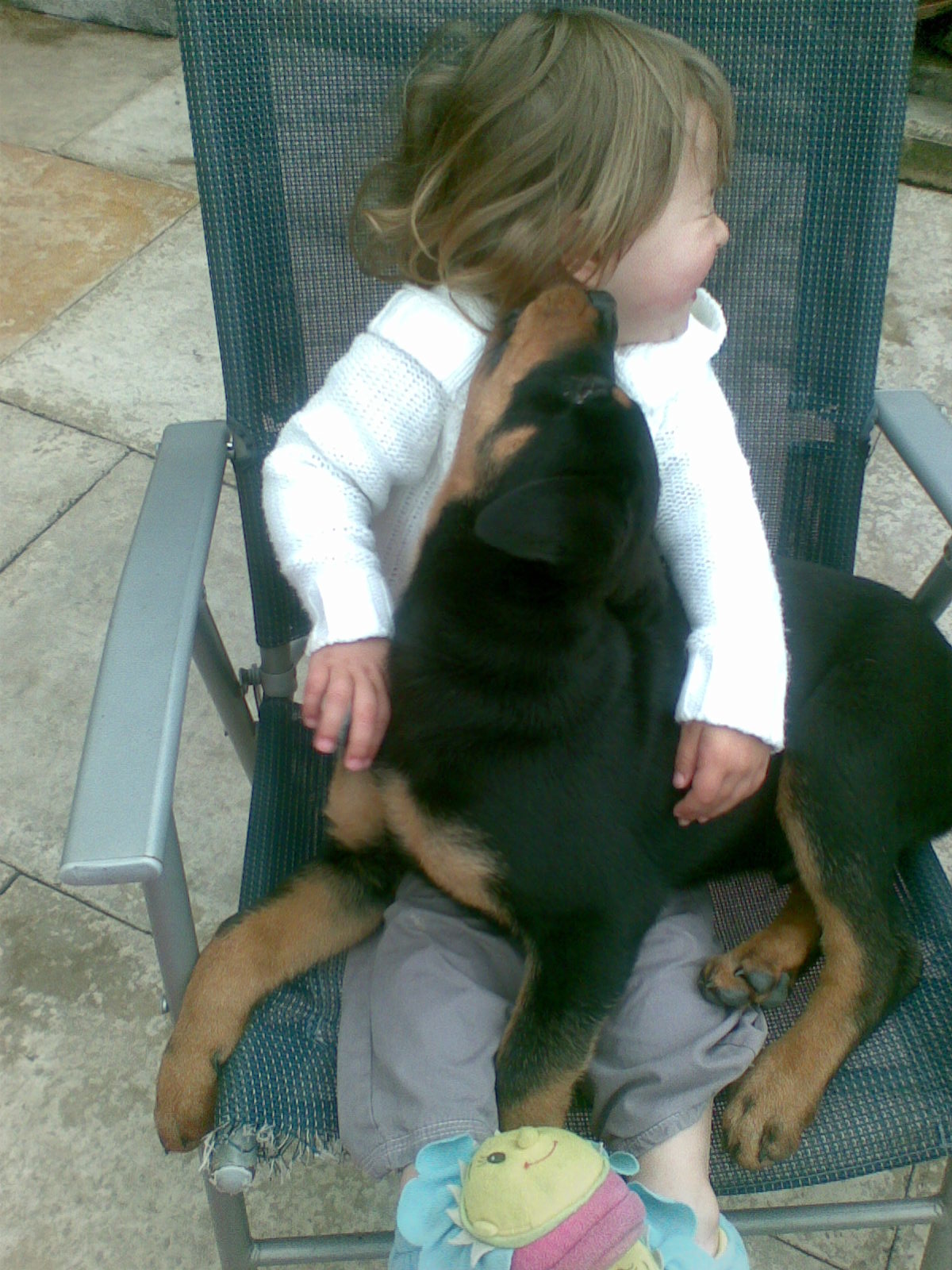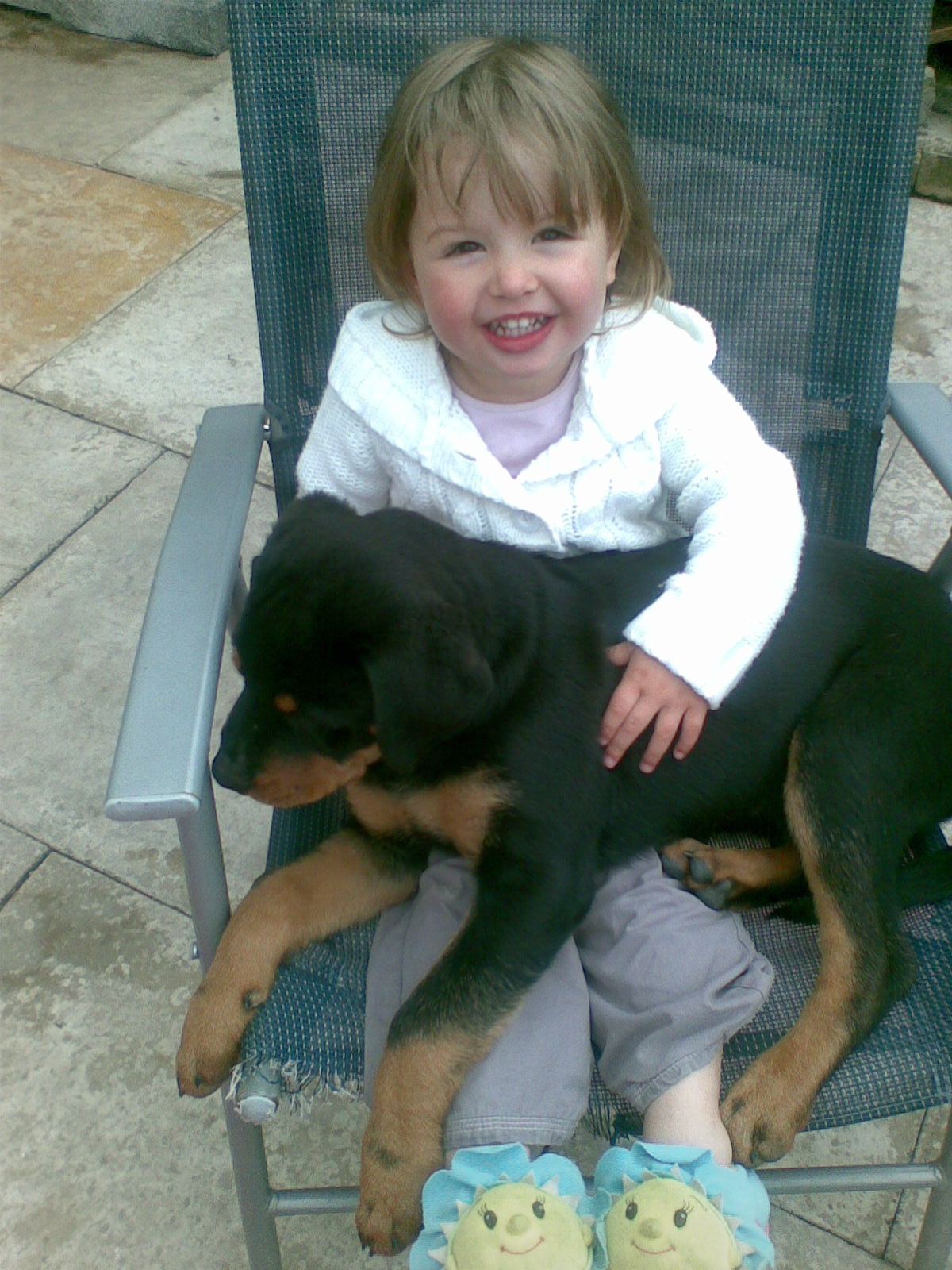 OK - I'll make sure that any pictures of Maggie that I post aren't aimed at coaxing you into puppy ownership! Maggie is looking more sweeter than ever, she will have lots of bones dropped on your doorstep from lots of admirers (of her own kind) as she gets older lol. I put some pics of my GSD's on a while ago. We now have a new pup called Alfie 4 mths old, he is a Rotteweiller & loves to play/fight with Missy nearly 3yrs, but C.J. 5 1/2 yrs will just sit & watch. Here are some pics of him & my grandaughter. Oh & 1 of my new grandson who is just 1 week old. Sorry just had to share.