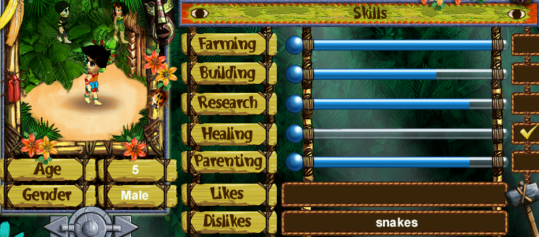 It's also sometimes sad that their parents reappear in the details screen. Often they've been long dead and are instantly recognisable as among the villagers who founded the tribe.