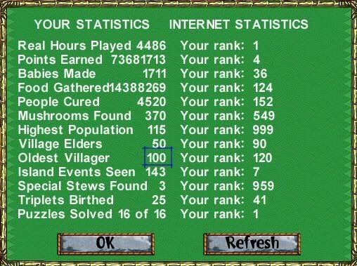 I have my two original villagers, one just made Elder today and the other's skill is teaching, researching and she's a very good swimmer (in the pond). They're both 74 at the moment, though the Elder is slightly oder- I'm only guessing because I don't know - but he turns 1 yr older first. I've been doing the "stew" and allowing him to do what he wants. I'm trying to keep him away from the manual labor - but he's stubbron!! He wants to work, and work he does! I just checked him and he was [ uncovering the ruins ] {highlight between the braquets, there is a spoiler there tho} She stays at the research table, which she's happy with. I try to make sure to drop him/her at the food bin often, he seems weaker than her - prone to "not feeling well", and I think its from the Master Builder in him. We'll see how long I can keep them going - but I sure hear the clock ticking and ooooooooh I'll be sad to see them go!!!!!!