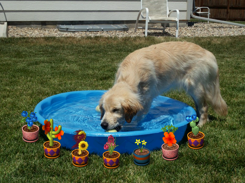 As arnie's instructions (in the post "Decorating my front path") show, it's very simple to substitute any of your own photos for the ones that come with the game. In this one, my Golden Retriever's wading pool is brightened up a bit with a few plants from the game.